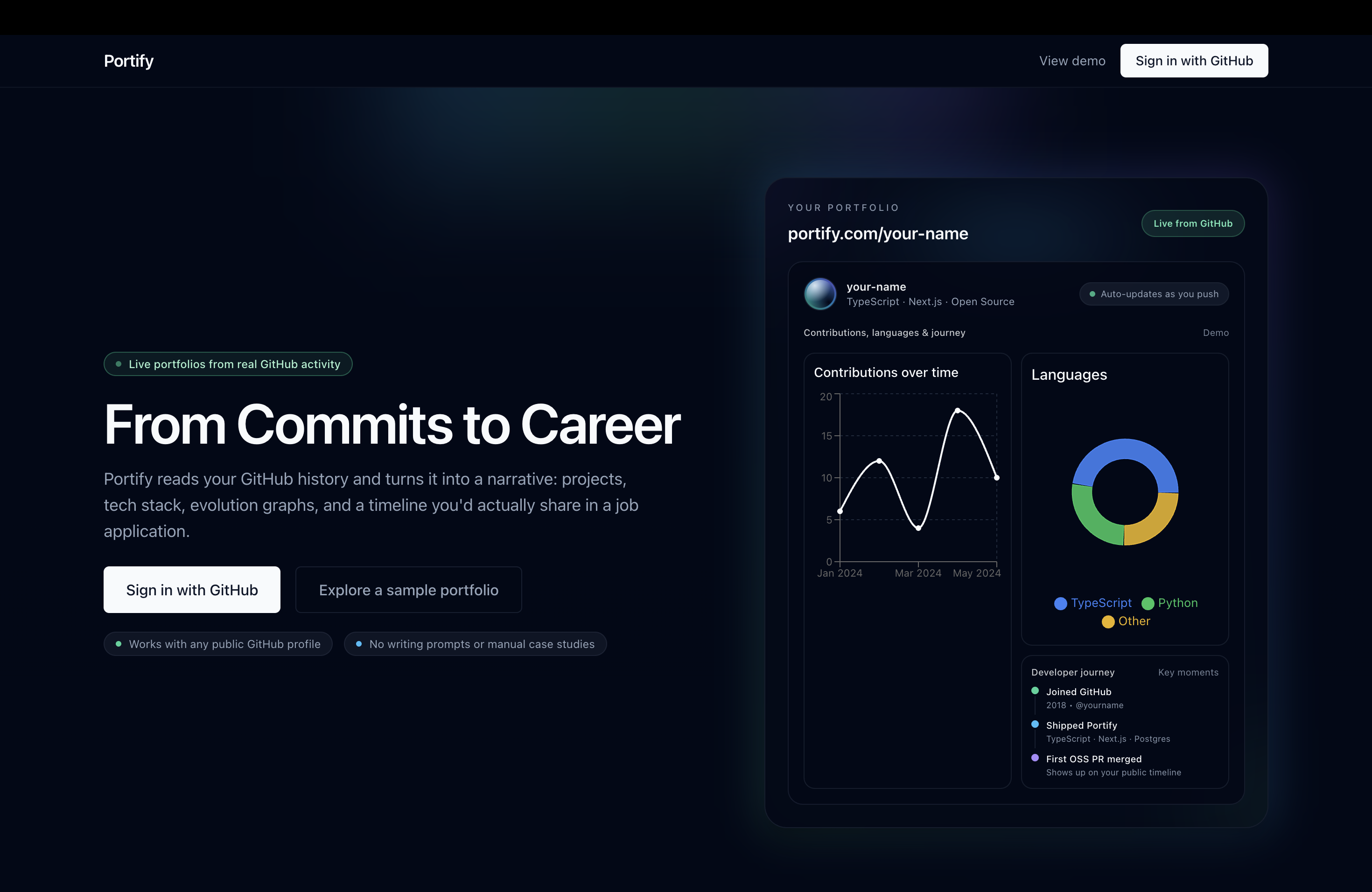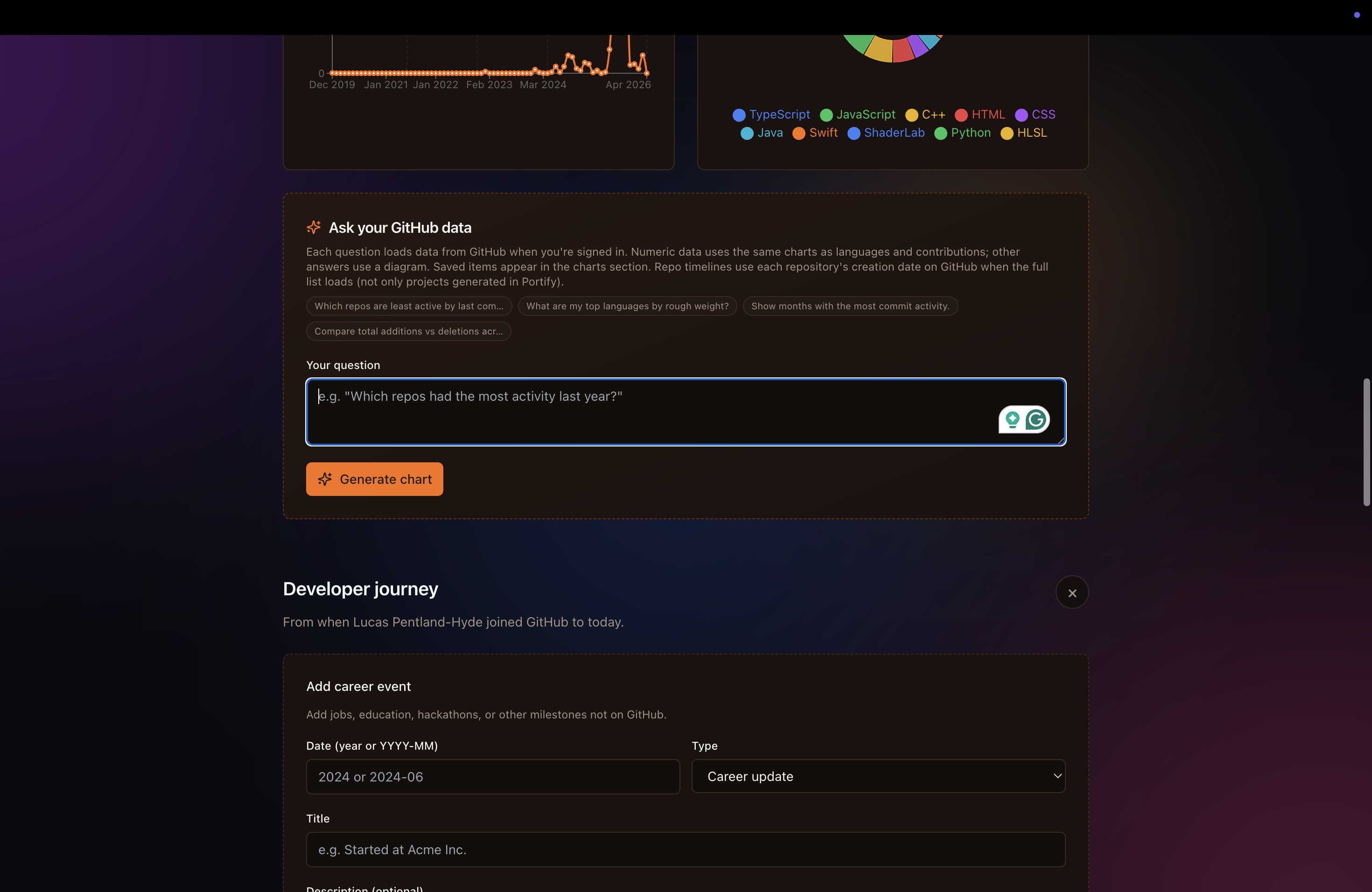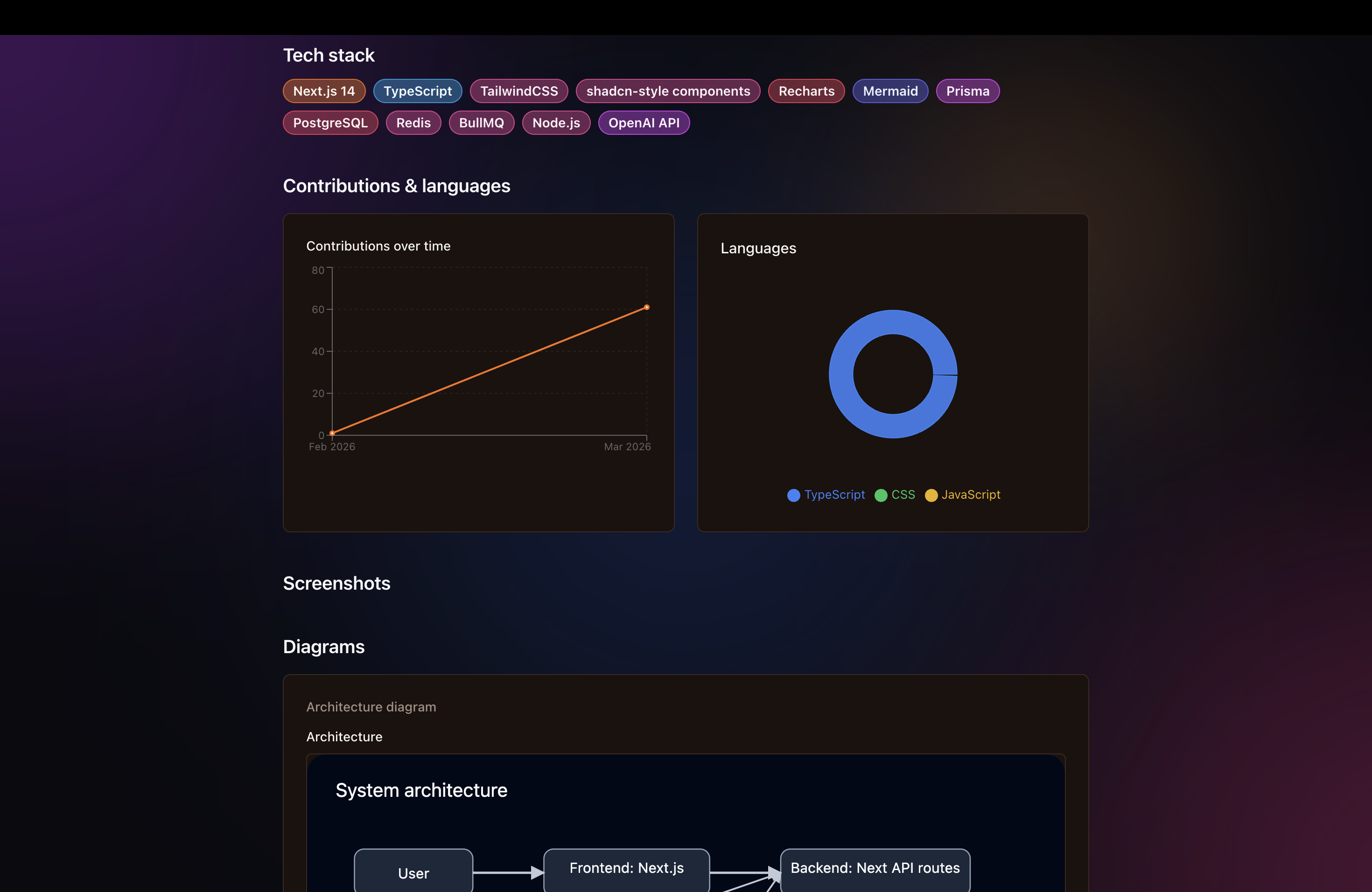 Tech stack, graphs, and charts automatically generated based on the user's project.