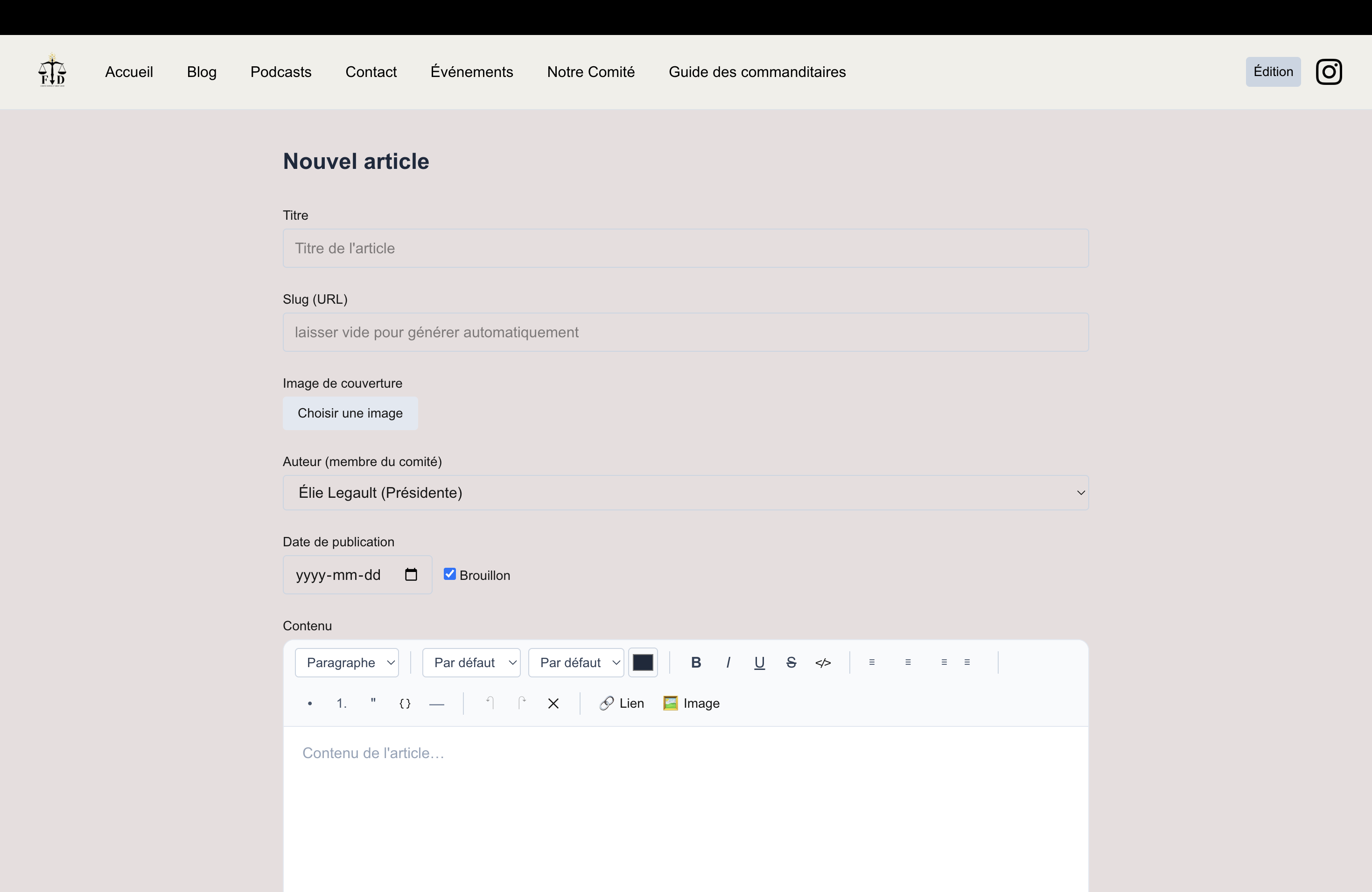 The blog creation page, which allows the admin to create a new blog post.